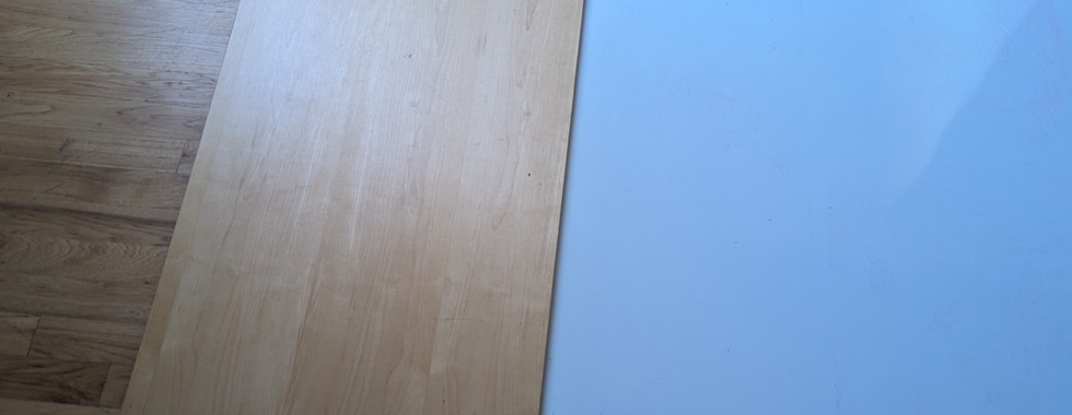 Perfect now that we have been able to split the 2 materials the air bubbles are now removed! But how do we make sure this doesn't happen again? When in doubt use would glue. Cover the wood in glue and then lay down the whiteboard material back onto the wood itself. Make sure there are no air bubbles in this process and then lay long pieces of wood over the material with weight to clamp the whiteboard into position.